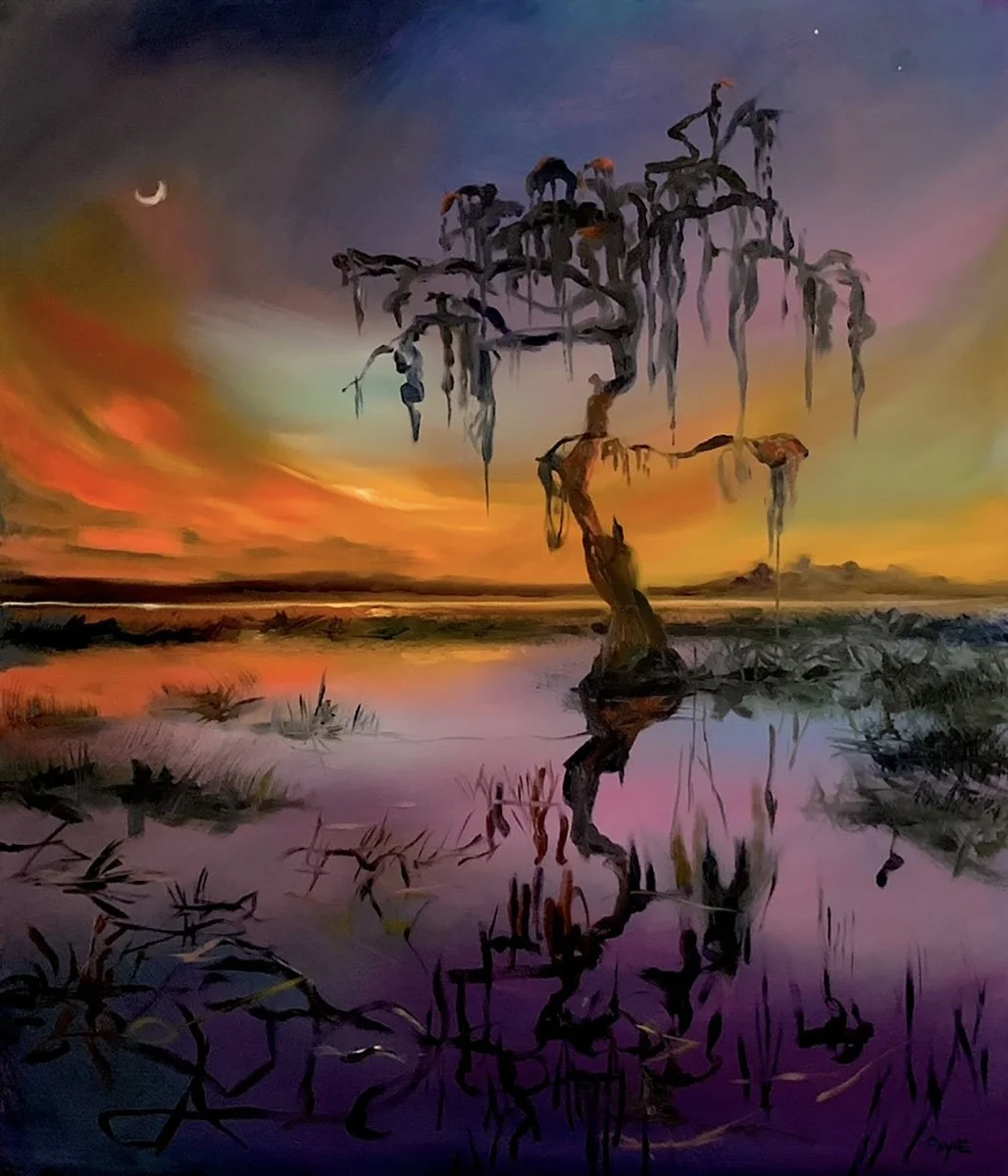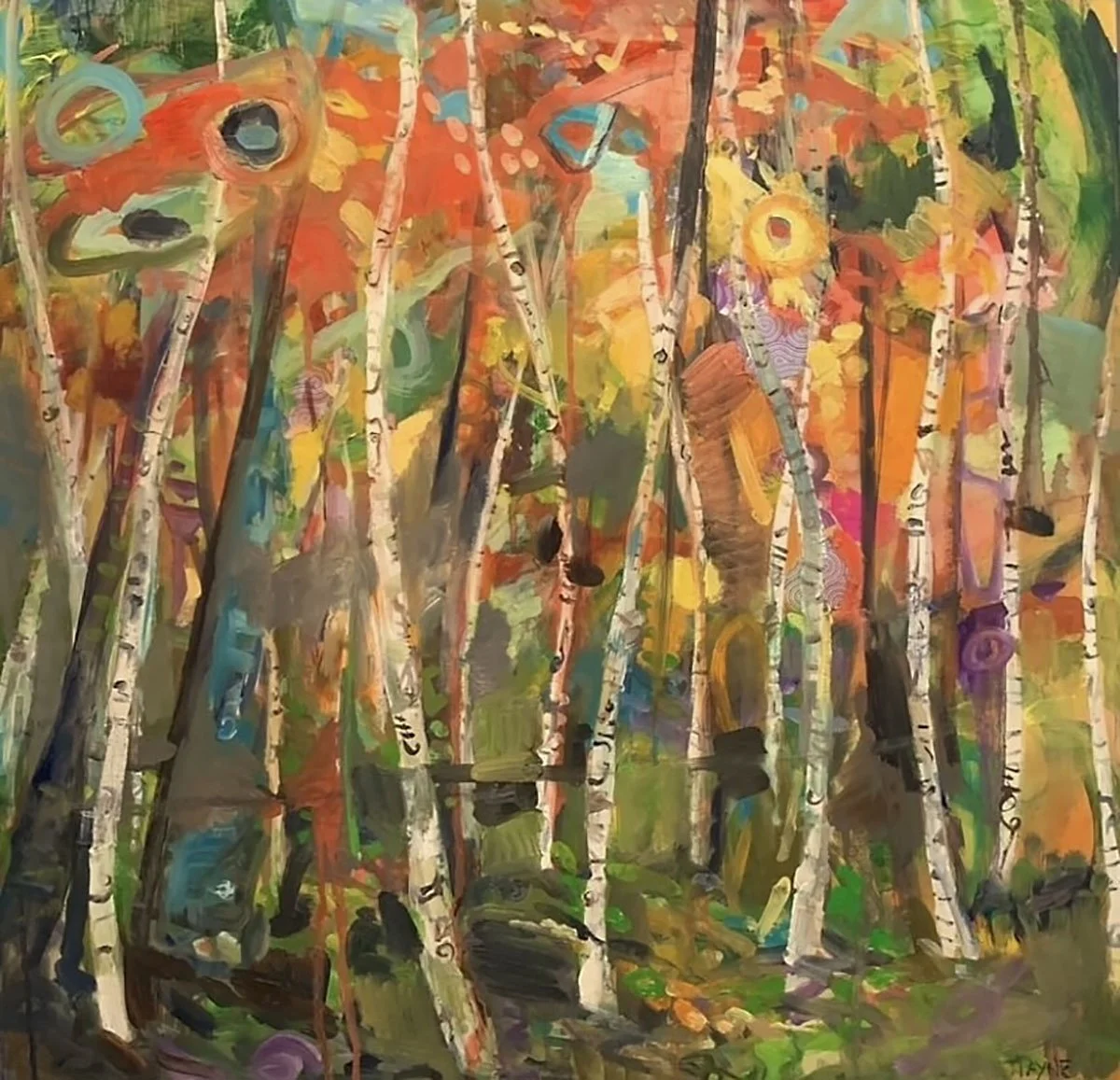 Her style is bold and expressive using any and everything to paint with: a palette knife, the brush handle of a brush, her fingers, cardboard, a squeegee, anything that moves the oil paint around to create the ever present textures and energy found in nature. She prefers working on wood because it can be manipulated through sanding, scratching, and scraping it, she just loves the tactile feel of it. Jennifer’s work is meant to instill positive feelings to the viewer and hopefully have them share in the freedom and joy she feels when creating the paintings.