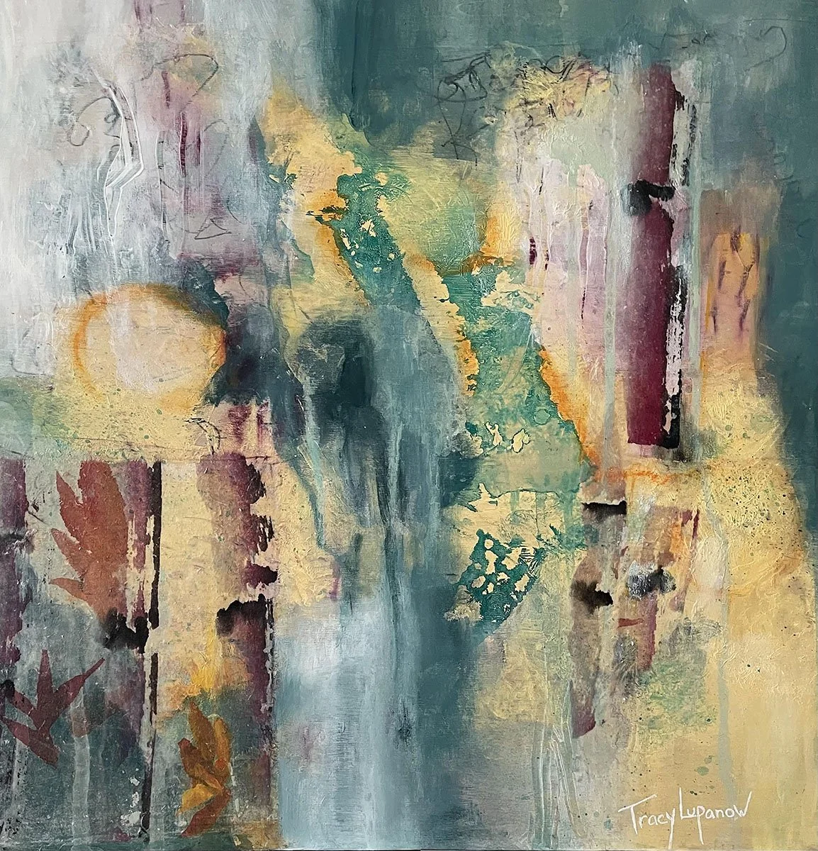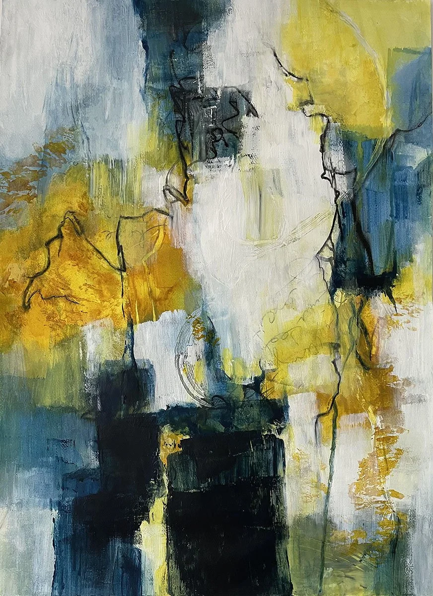 Over the years my work has shifted from representational watercolors to bold and expressive abstract mixed-media paintings. From a distance, they catch your attention with bold color. Up close, they tell an intimate story through texture and detail. As I draw and paint layer upon layer, my paintings begin to develop a history that naturally unfolds as I react intuitively and enjoy the process of what is emerging. I combine the elements of line, color, shape, and composition to capture emotional energy rather than an image.